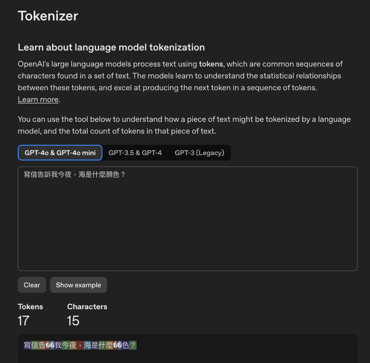 為了讓開發者理解 AI 到底「看」到了什麼, AI 公司也會提供了 Tokenizer 視覺化工具。透過這些工具,使用者可以看到一句話是如何被拆解的。當 Prompt 效果不佳,去檢查 Token 的切分方式,也許能找到病灶。可能是一個特殊的符號被切成了十幾個無意義的碎積木,浪費了寶貴的視窗空間與金錢。